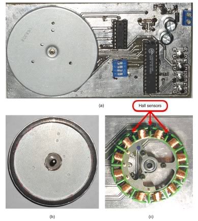-Hall sensor: do đặc thù sức phản điện động có dạng hình thang nên cấu hình điều khiển thông thường của BLDC cần có cảm biến xác định vị trí của từ trường rotor so với các pha của cuộn dây stator. Để làm được điều đó người ta dùng cảm biến hiệu ứng Hall, gọi tắt là Hall sensor.