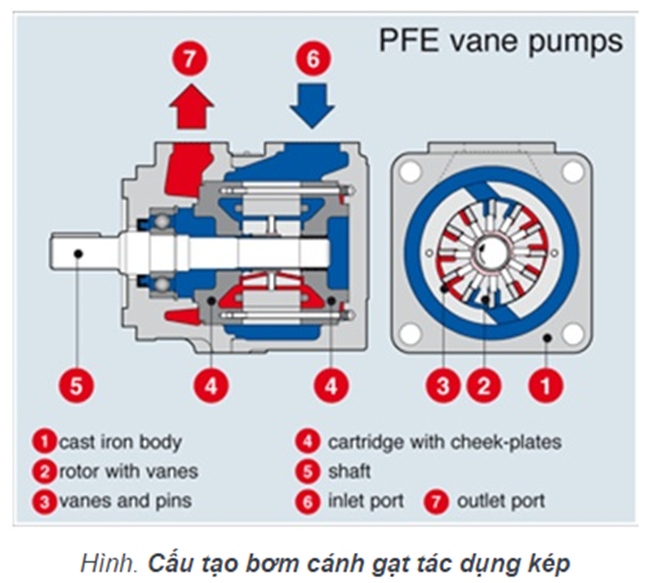 Cấu tạo của bơm cánh gạt tác dụng kép gần giống với bơm cánh gạt đơn, chỉ khác ở cấu tạo vỏ bơm: